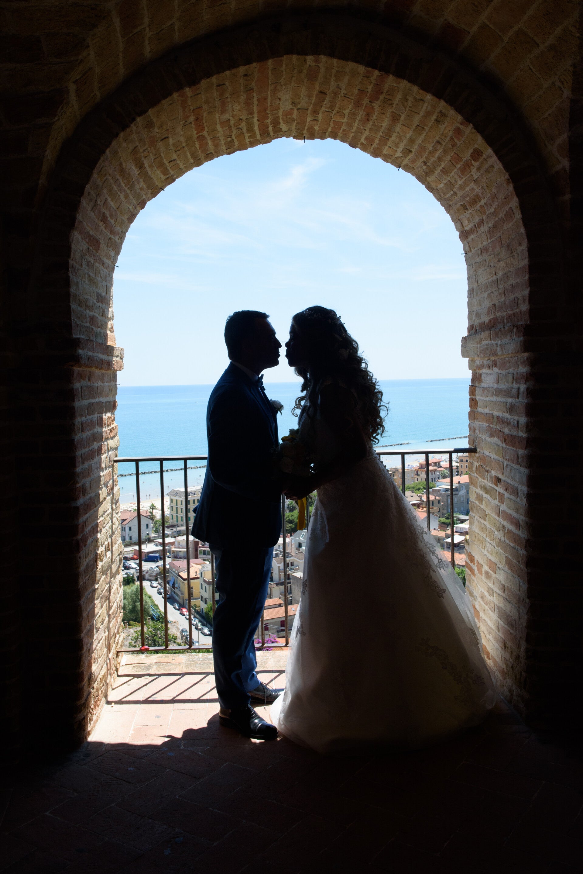 Questo matrimonio mi ha dato la possibilita' di lavorare in due province diverse nella stessa giornata: la cerimonia nel cuore del borgo medievale di Grottammare, nel piceno, e la festa a Marina Palmense, nella provincia di Fermo. Due atmosfere completamente diverse — la pietra antica del borgo antico e la luce aperta della villa sul mare — che insieme hanno raccontato una storia ricca e articolata.