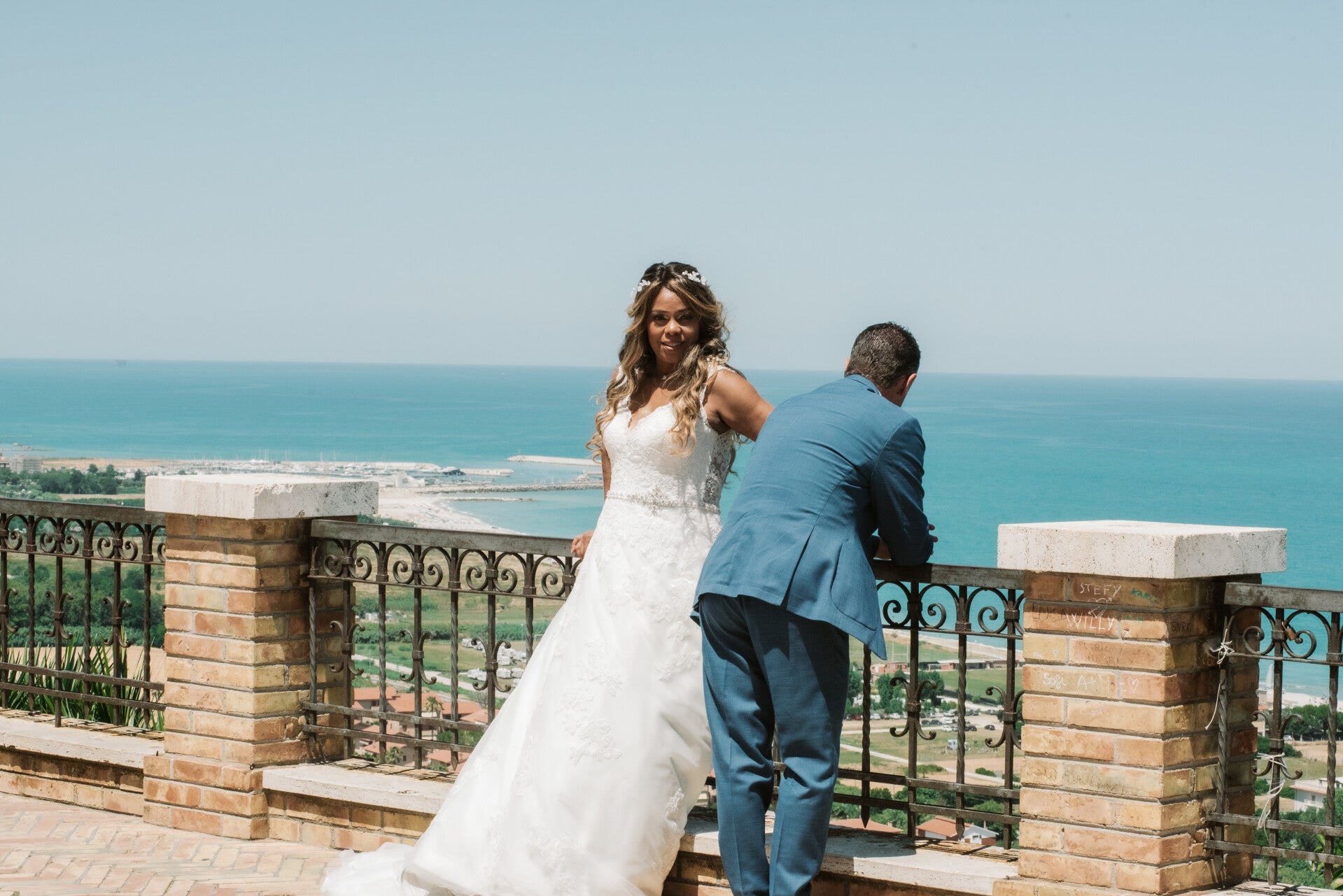 Alipia e Riccardo hanno scelto il rito civile, e la scelta di celebrarlo qui aveva tutta la sua logica. Niente navata, niente altare — solo loro due, le persone a cui vogliono bene, e quel panorama sul mare che fa da sfondo.
