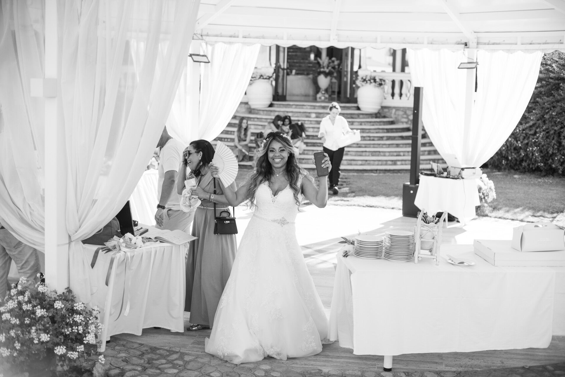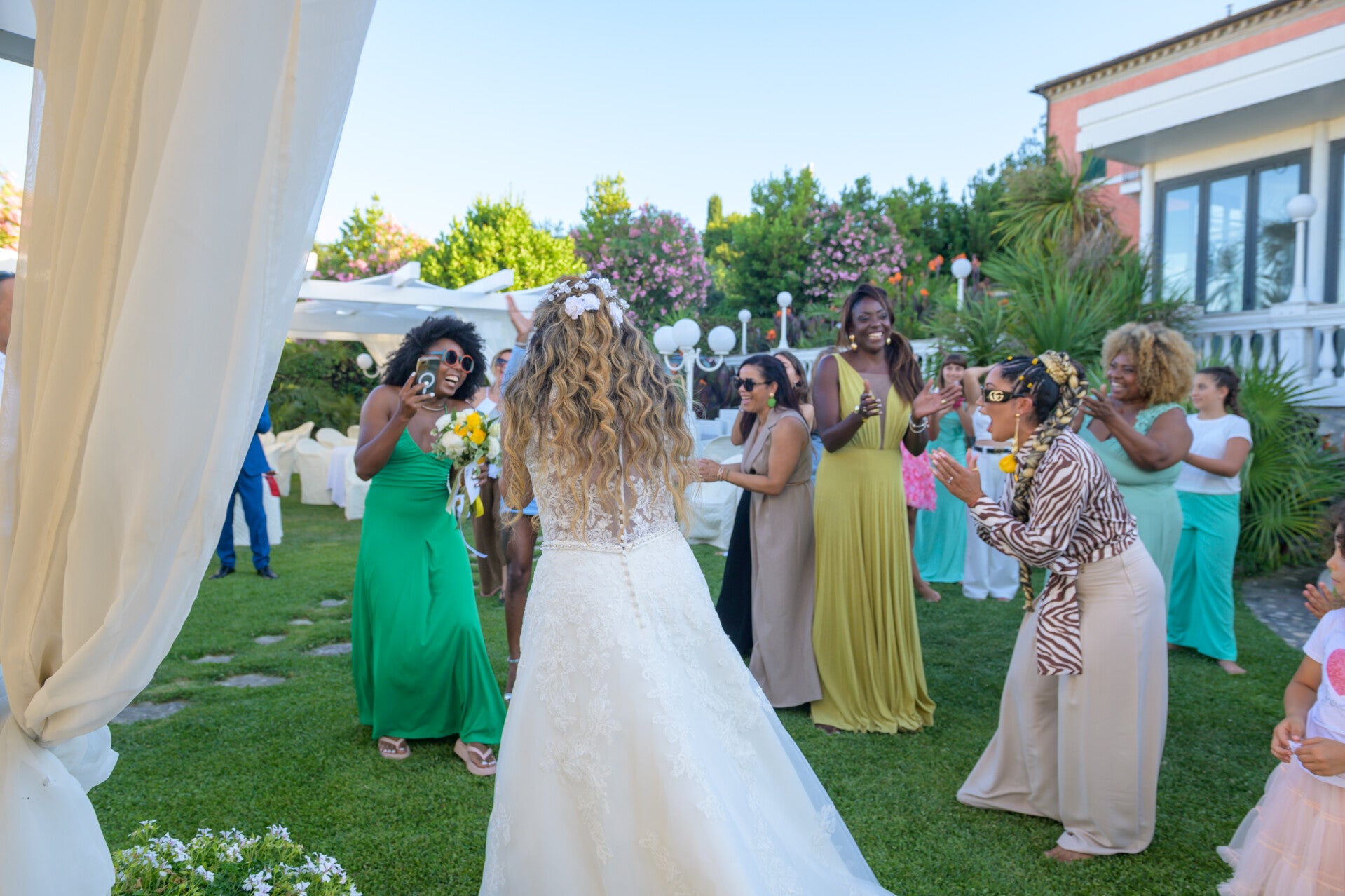 Ho fotografato tutto: i tavoli apparecchiati nella luce del tardo pomeriggio, gli ospiti che si muovevano tra un gruppo e l'altro, i brindisi, le risate. E in mezzo a tutto questo, ho tenuto d'occhio Alipia e Riccardo — sempre al centro, sempre sorridenti, sempre presenti.